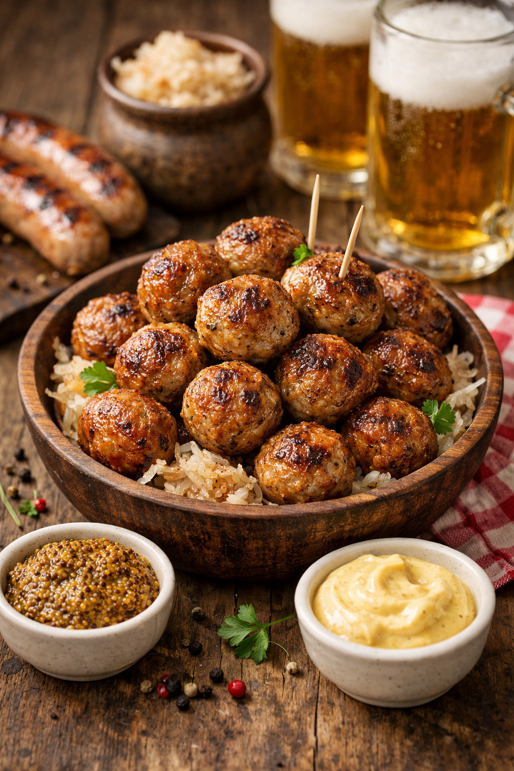 Our 'Ballschen' are designed to be the star of our hearty food trailer soup line. We recommend serving them warm at the bottom of a bowl, topped with melty Alpen Bauern Kase cheese strips, and finally, a ladle of rich Bavarian soup. It's a true Bavarian Soup Haus experience that promises to satisfy the hungriest of appetites. For our 'Sausage Logs', we suggest slicing them thinly to be enjoyed with our artisan breads and robust brown mustard. They're perfect as a standalone snack, a feature on a brotzeitbrett board with pickles and a bier, or alongside sliced cheeses.