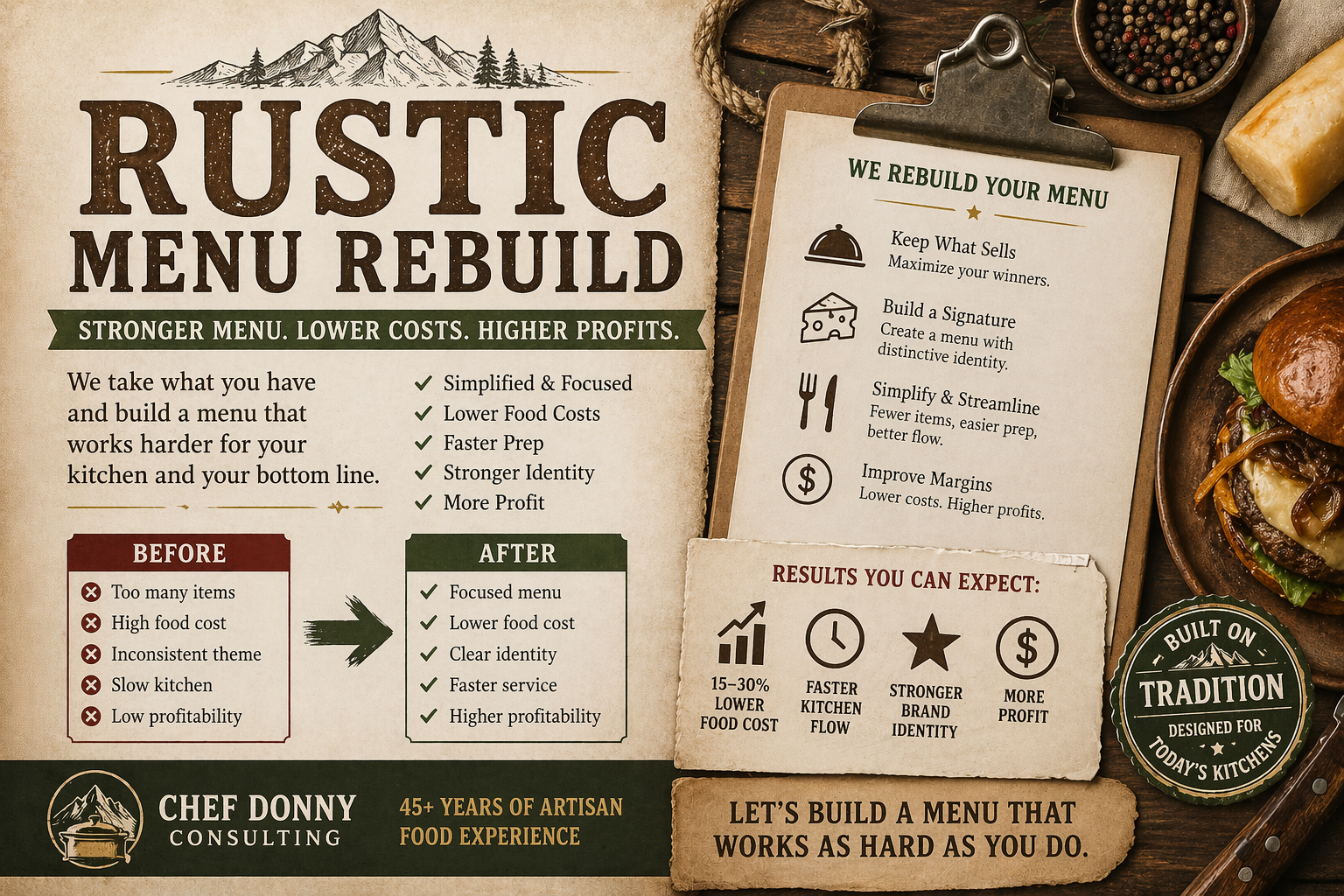 Keep what sells—remove what doesn’t. Services include menu simplification, ingredient consolidation, and pricing guidance.